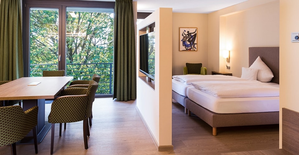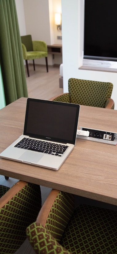 Take a seat with up to 6 people at our large conference table in one of our conference suites. 34 sqm as well as a balcony offer here free space for your topics. With pleasure we entertain you beside the available coffee machine according to your expectations.